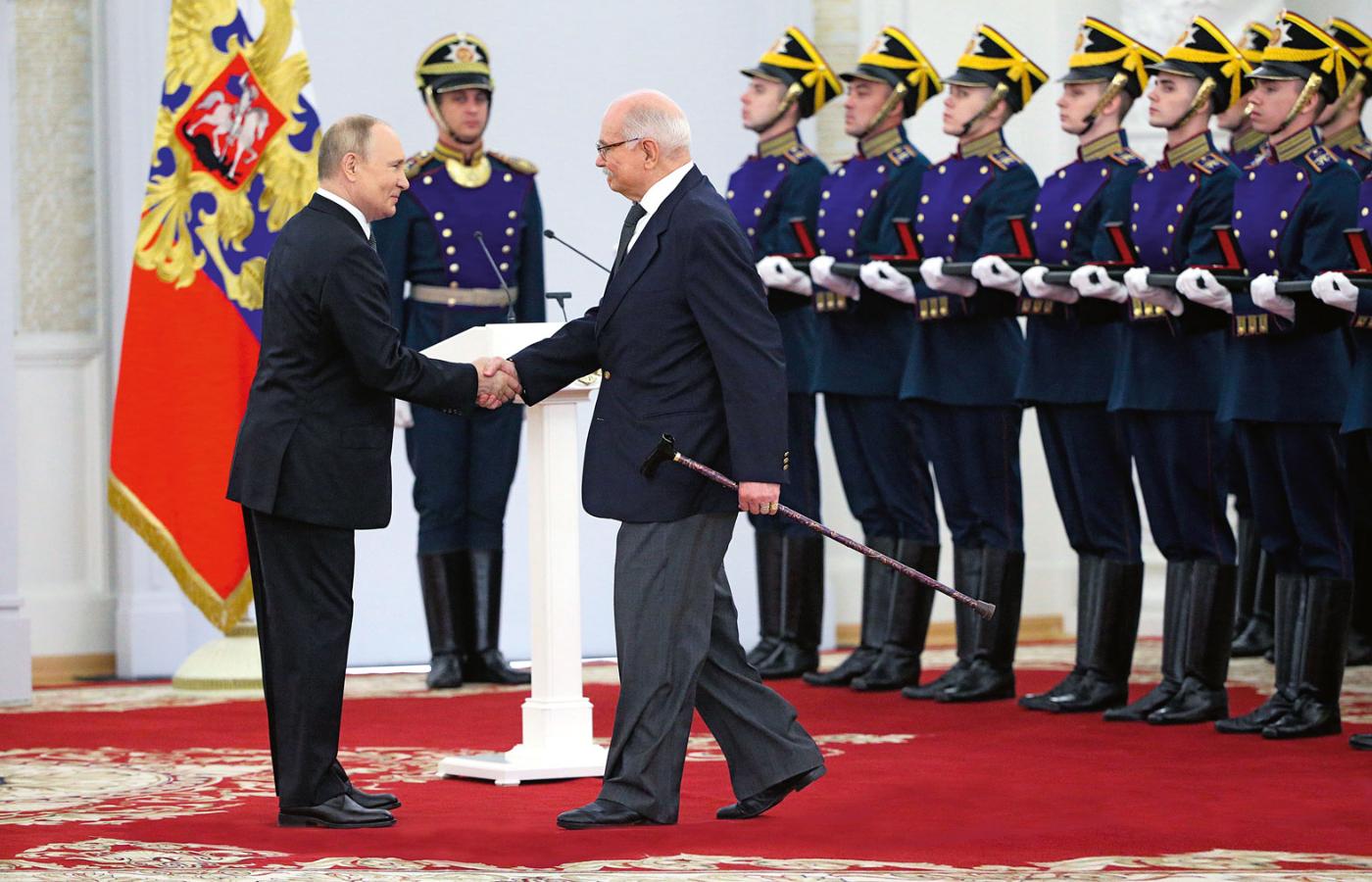 W końcu laureat porusza wątek osobisty: „Stoję tutaj, a tam za ścianą, w 1615 r. mój przodek Konstantin Michałkow był strażnikiem pieczęci państwowej na dworze Michała Fiodorowicza, pierwszego z dynastii Romanowów”. Prezydent kiwa z uznaniem głową, choć zauważa, że akurat w jego rodzinie przeważali chłopi i robotnicy.