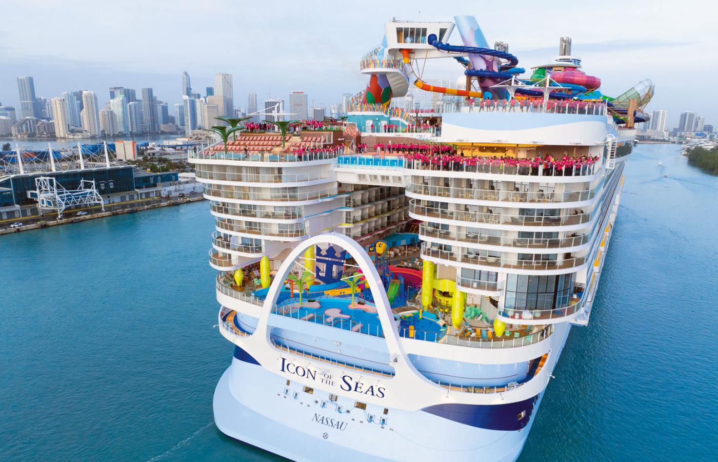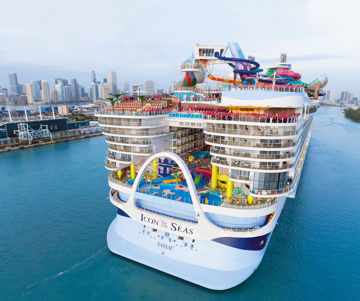 Ochrzczony przez samego Lionela Messiego „Icon of the Seas”, największy na świecie statek wycieczkowy, ruszył właśnie z Miami na Florydzie w swój dziewiczy rejs. Wszystkiego ma więcej. 250 tys. ton wyporności (tyle co pięć „Titaniców”), 365 m długości, 20 pokładów, 7,6 tys. pasażerów, 2,4 tys. załogi. Do tego 40 restauracji, największy park wodny i takaż sala widowiskowa, symulator surfingu, lodowisko, ścianka wspinaczkowa – i długo by wymieniać. No i kosztował 2 mld dol.