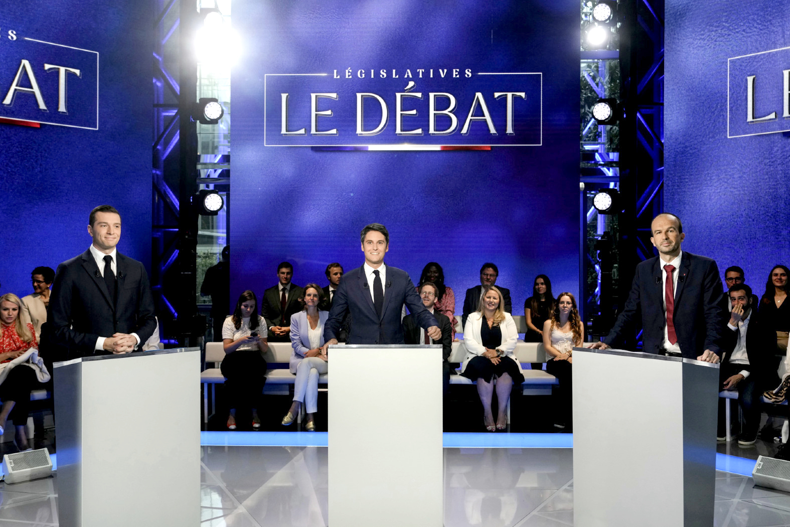 Udział w debacie wzięli wyłącznie potencjalni kandydaci na premiera – obok Gabriela Attala z obozu prezydenckiego, dawniej ministra edukacji, który dziś walczy o utrzymanie stołka, zasiadł Jordan Bardella, przewodniczący partii Rassemblement National (Zgromadzenie Narodowe, spadkobierca Frontu Narodowego), oraz Manuel Bompard, koordynator La France Insoumise (Francji Nieujarzmionej), który mówił jako przedstawiciel szerokiej koalicji lewicowej Nuveau Front Populaire (Nowy Front Ludowy).