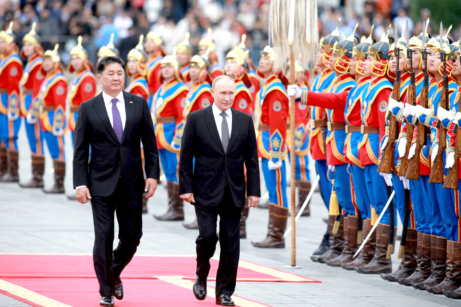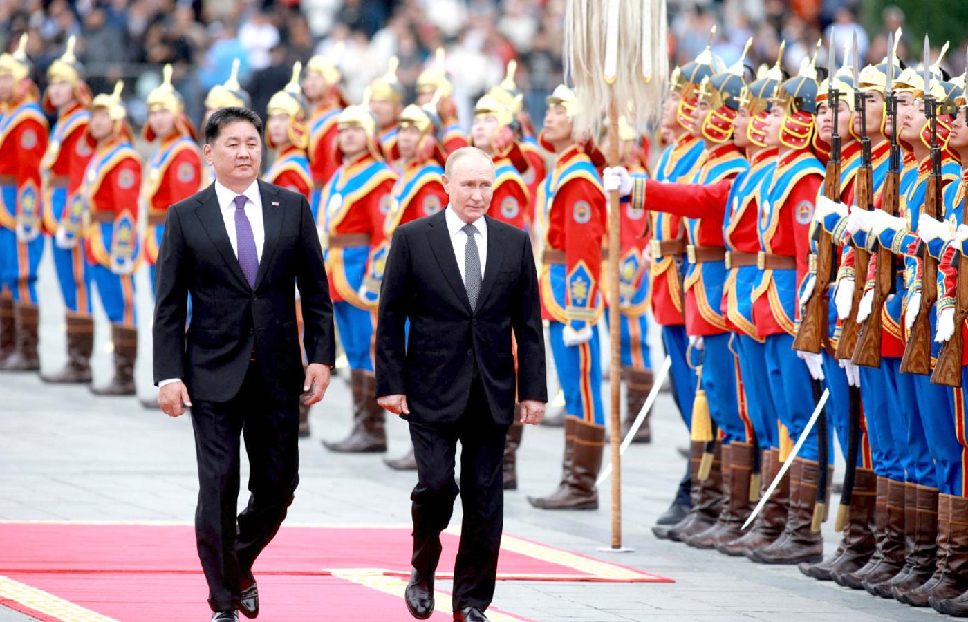 Putin wylądował tu we wtorek, witany przez prezydenta Ukhnę Khurelsukha oraz szefową MSZ Batmunkh Battsetseg. Zdjęcia z powitania go na stołecznym lotnisku pokazują ceremonialny szpaler gwardii honorowej w mundurach przypominających stroje z czasów imperium Czyngis-chana. Kolejne punkty podróży obejmowały pokłon pod pomnikiem legendarnego imperatora i spotkanie w pałacu prezydenckim, a także uczestnictwo Putina w obchodach 85. rocznicy zwycięstwa sowieckich i mongolskich wojsk nad armią Japonii, wówczas okupującą Mandżurię. Nic nie wskazuje, żeby w trakcie jego pobytu u południowego sąsiada miało dojść do aresztowania albo chociaż konfrontacji na temat zarzutów MTK.