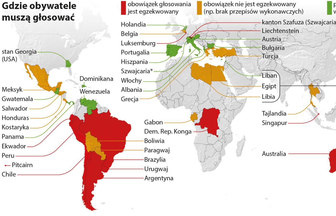 W większości regionów świata nie ma obowiązku udziału w wyborach – zazwyczaj jeden, dwa, trzy kraje to wyjątki.
