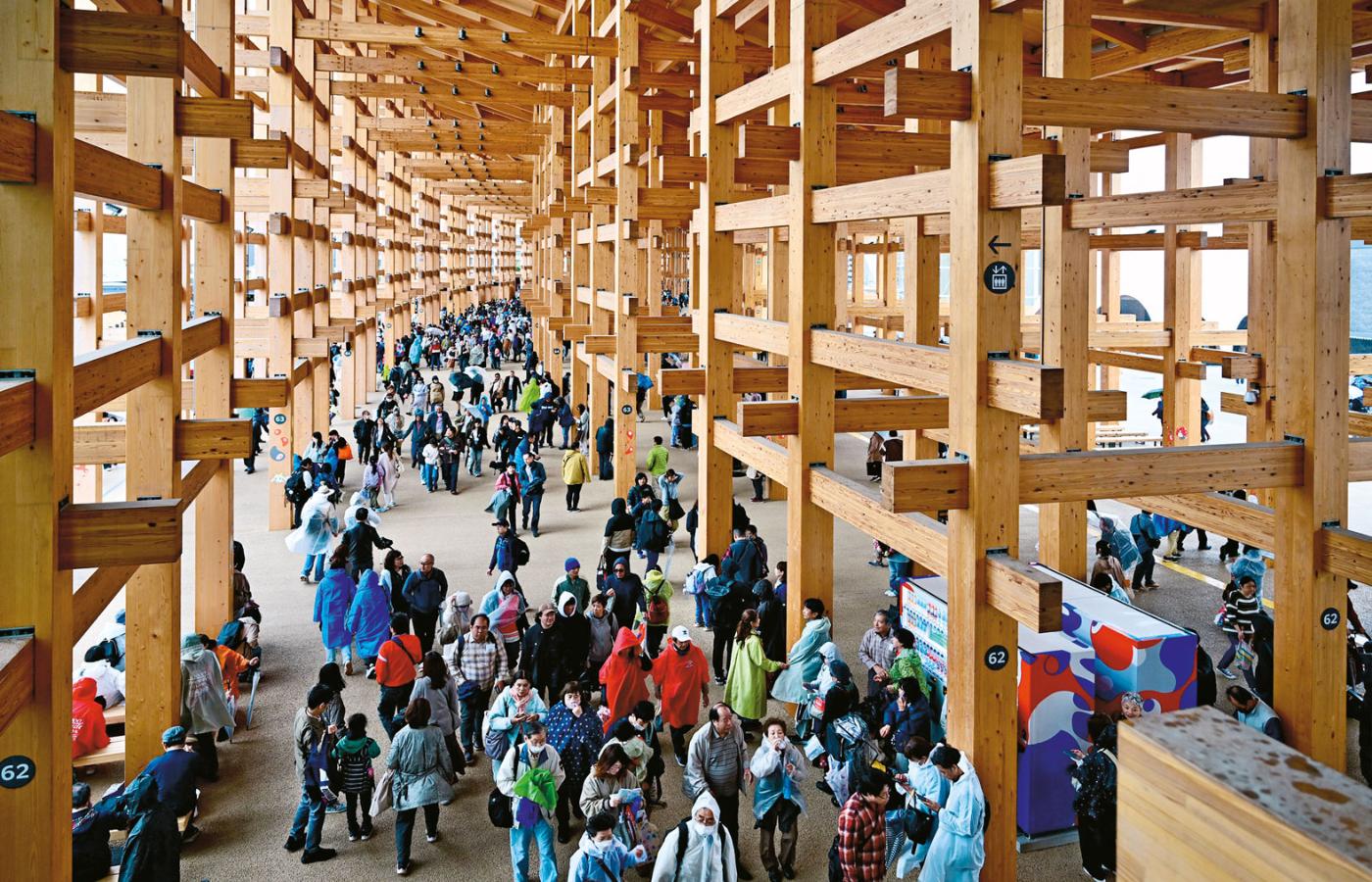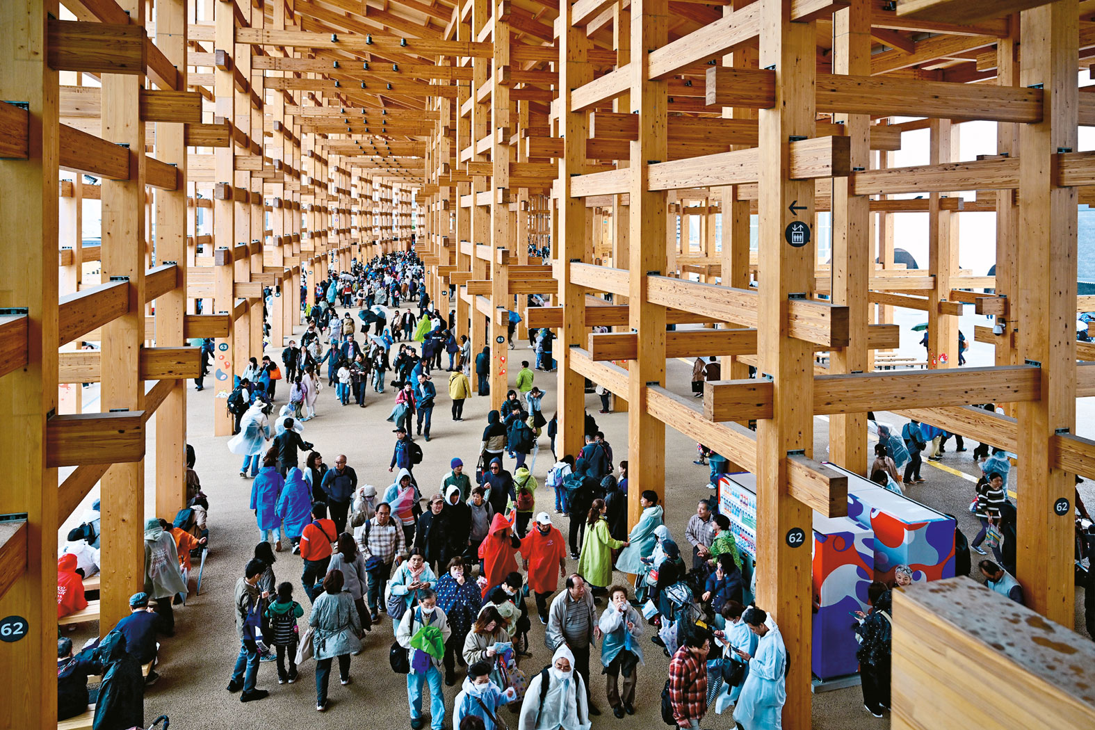 Teraz hasłem jest zrównoważona przyszłość. Nad terenem wystawy (sztucznej morskiej wyspy i dawnym wysypisku odpadów przemysłowych) góruje dwukilometrowa rotunda z promenadą, będąca najdłuższą konstrukcją z drewna na świecie. W podobnej technice, bez użycia jednego gwoździa, stawia się japońskie świątynie. Drewnianą fasadę ma pawilon Polski, zielonych akcentów i deklaracji troski o naturę jest mnóstwo, Brazylia postawiła na artystyczne instalacje przestrzegające przed klimatyczną apokalipsą. Przyciąga doskonale zaprojektowany pawilon Ukrainy, który oszczędnymi środkami – dziecięcą zabawką lub pontonem – opowiada wyposażonym w czytniki zwiedzającym o swojej heroicznej obronie przed Rosją (która nie bierze udziału).