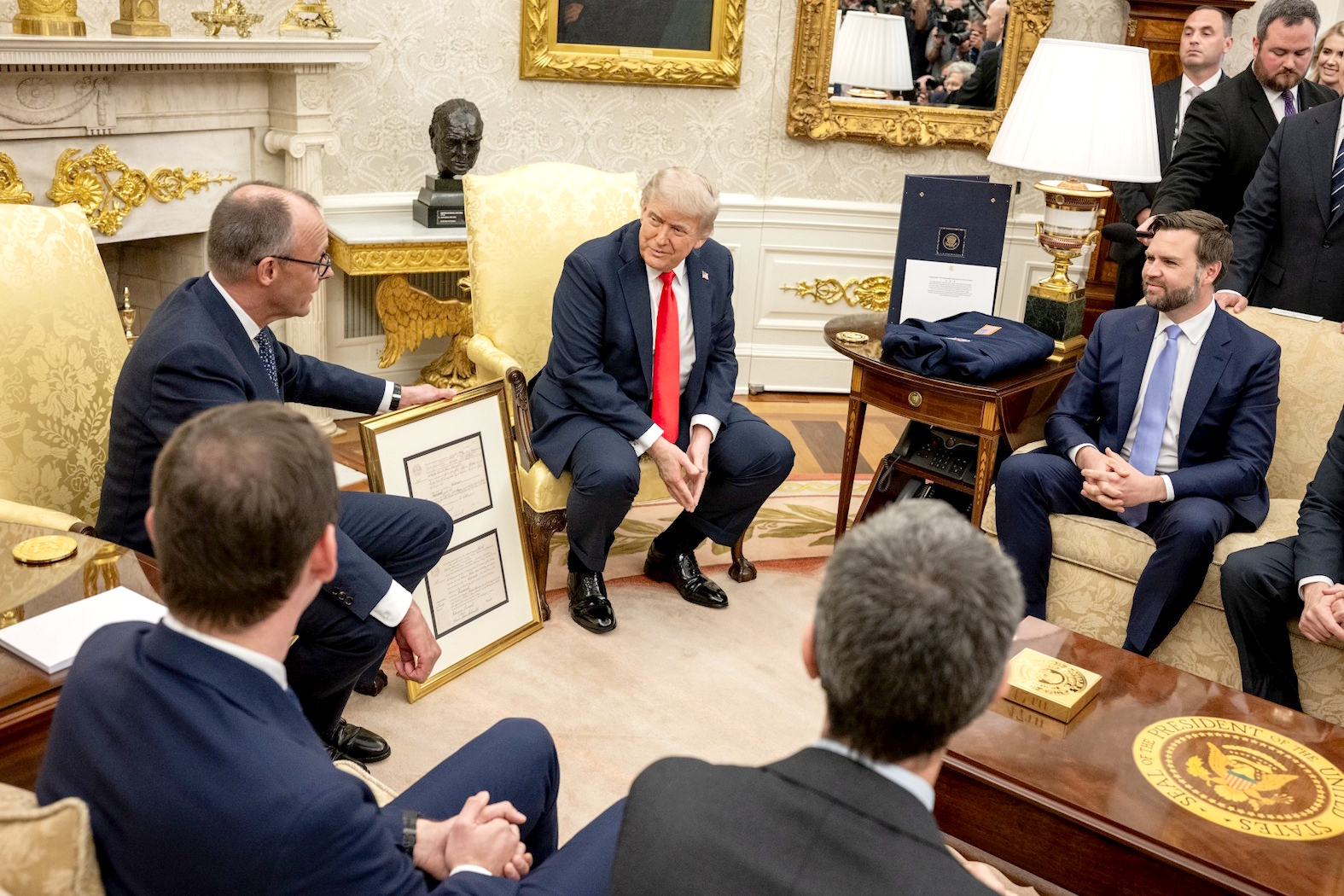 Podczas transmitowanego na żywo i otwartego dla wybranych mediów wstępnego spotkania obu przywódców w Gabinecie Owalnym Trumpa zapytano m.in. o to, czy USA będą nadal pomagać Ukrainie. Prezydent odpowiedział: „Tak, jestem z Ukrainą”. Dziennikarze dopytywali, czy wobec odmowy zawieszenia broni przez Putina gotów jest wywrzeć na niego presję, i tutaj już Trump kluczył.
