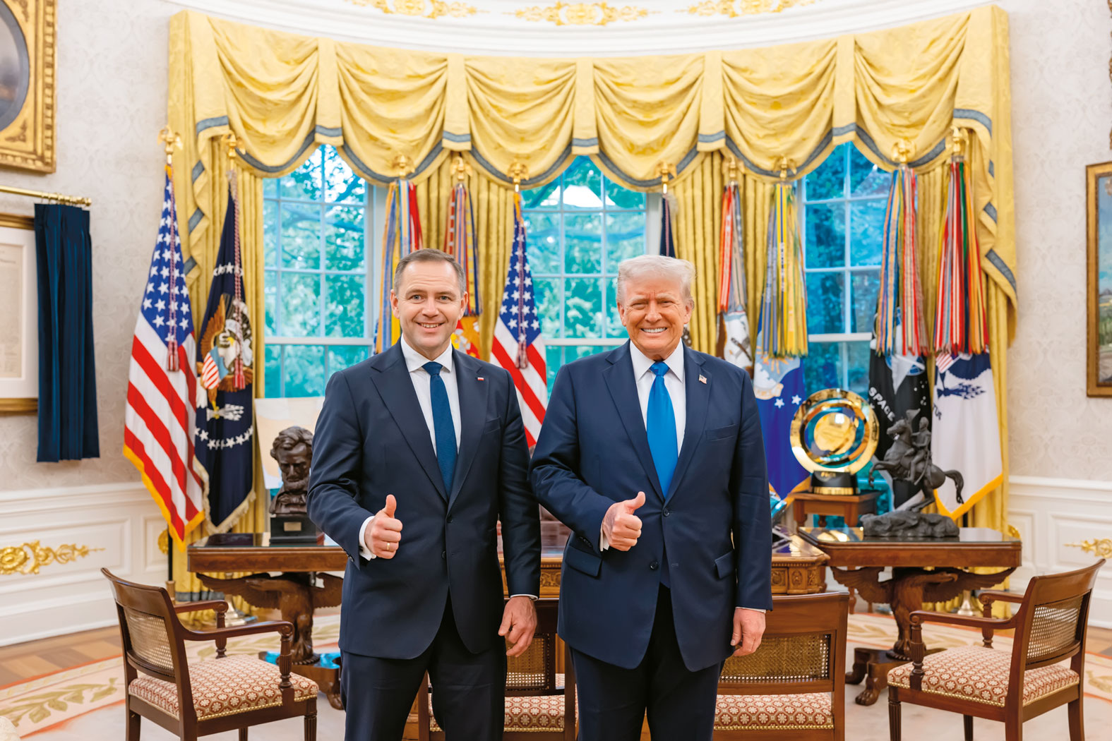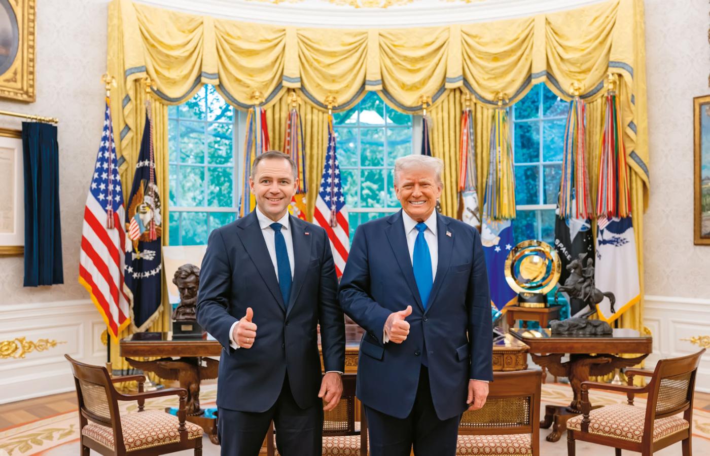 A kiedy się okazało, że kandydat jednak dotrze do stolicy USA, to jako jeden z kilkuset gości na ceremonii z okazji dorocznego Narodowego Dnia Modlitwy z udziałem Trumpa. „Spotkanie z prezydentem nie jest planowane” – zapewniano podekscytowane polskie media. Aż tu nagle bomba – zdjęcie Nawrockiego z Trumpem w Gabinecie Owalnym, uniesione kciuki w geście triumfu i oświadczenie prezydenta: „Wygrasz”.
