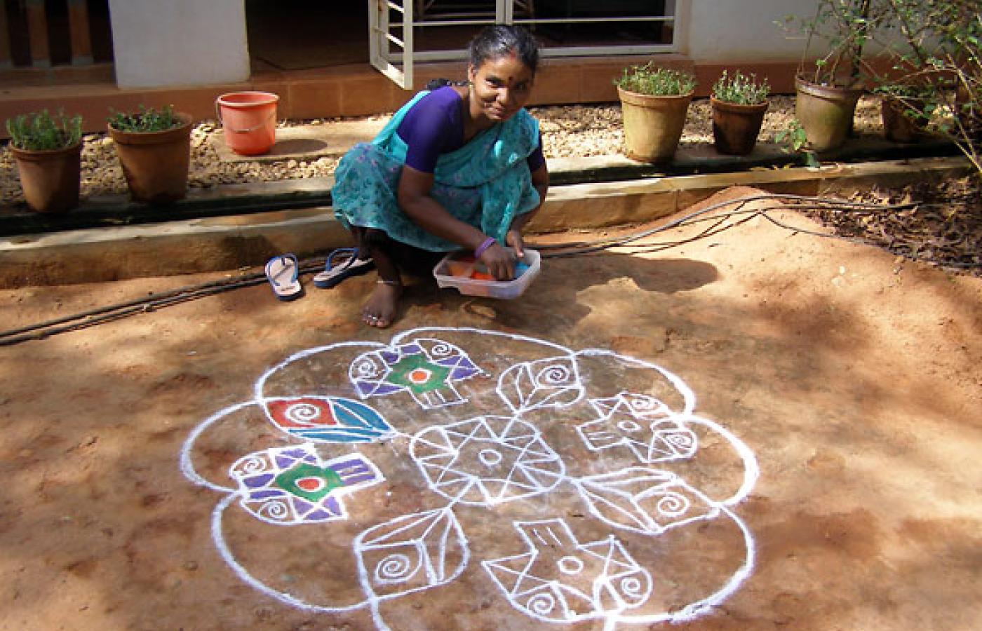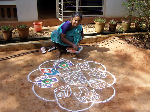 Bez Vasanthi dom zamarłby i zszarzał. Ona jedna z całej trójki wie, dlaczego generator nie działa, ile trzeba kupić benzyny, gdzie w ogrodzie zaszył się wąż, którędy Bul Bul, najbardziej rozwydrzony z psów, wykrada się na łupłowy. Już od rana w pokojach stoją świeże kwiaty, a w południe kolczaste owoce z naszego rajskiego ogrodu rozbrojone leżą na tacach. Za każdym razem, kiedy przestępujemy próg, na czerwonej ziemi usypany jest całkiem nowy kolorowy kolam z pudru ryżowego. To poranna modlitwa Vasanthi.