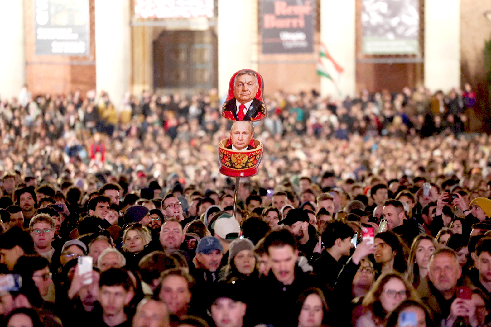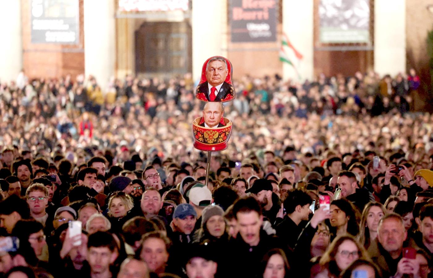 Na plakacie zawarłem przesłanie do wyborców Fideszu. Napisałem, że są tacy sami jak my, ale muszą się obudzić i do nas dołączyć. Jeśli nie zrobią tego w niedzielę, będzie już za późno – mówi Bence, 23-letni student z Budapesztu. W kurtkę wpięte ma dwie przypinki: jedną z logo Amnesty International, drugą z twarzą Pétera Magyara, lidera opozycyjnej partii TISZA. Na transparencie litery w słowach „za późno” pomalował w kolorach rosyjskiej flagi. To nie przypadek, bo, jak tłumaczy, dla młodych Węgrów jest oczywiste, że Fidesz jest partią „już nawet nie prorosyjską, a po prostu realizującą rosyjskie interesy”.