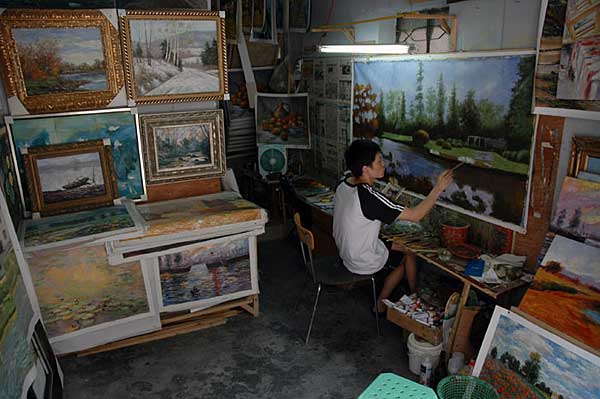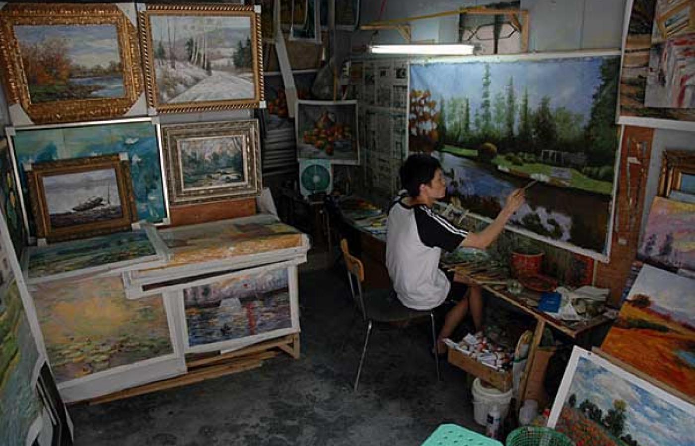 41-letni Huang jest kopistą sztuki. Na t-shircie nosi ciemną marynarkę, a rozczochrane włosy upodabniają go do chłopa. Do Dafen sprowadził się z prowincji w połowie lat 90. Był młody, miał talent do rysowania i pilnie potrzebował pracy. W Dafen powstawały wówczas pierwsze warsztaty kopiarskie, gdzie powielano dzieła sztuki. Wspólnie z dziesiątkami innych malarzy Huang kopiował obrazy taśmowo. Często się zdarzało, że produkował tuzin obrazów dziennie. Do pracy zatrudniano coraz więcej malarzy. Obecnie Dafen w południowych Chinach jest największą kolonią artystów na świecie. Pięć tysięcy ludzi żyje tam z kopiowania wielkich dzieł sztuki.