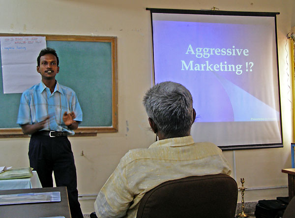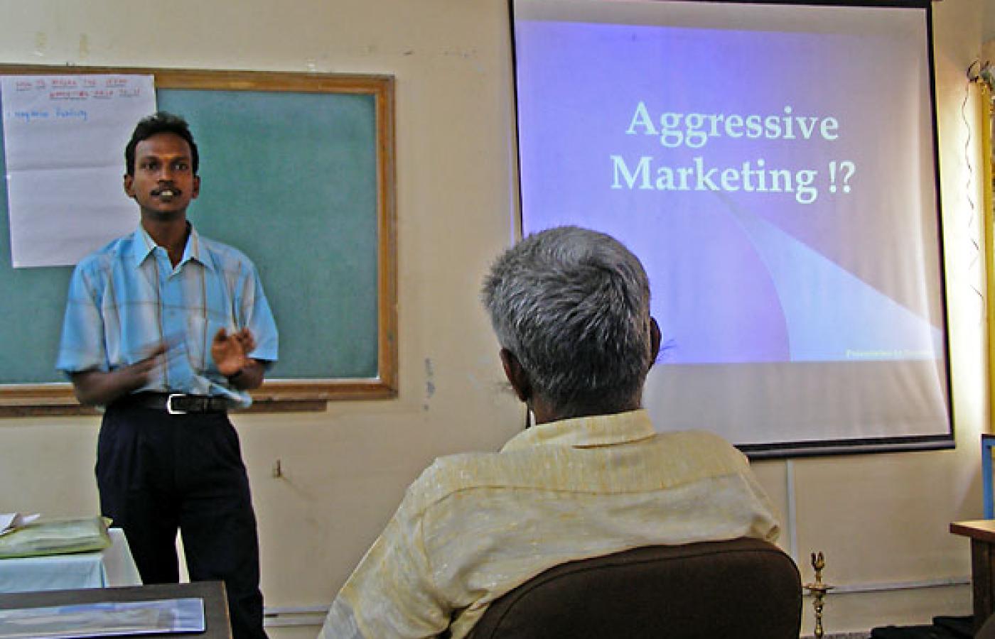 "Trendy!", próbuje tłumaczyć pani menadżer z amerykańskiej firmy, omawiając slajdy z przeglądem najnowszych kolorów i wzorów. Gładko ogolony specjalista do spraw produktu, w modnie skrojonym garniturze, prezentuje możliwości platformy internetowej, którą jego firma z Bangalore stworzyła z myślą o wieśniakach, żeby mogli handlować online, jak Amerykanie. Brazylijczyk na stypendium z mikrofinansowania podnosi rękę: - Super. Ale czy we wsiach jest dostęp do internetu?