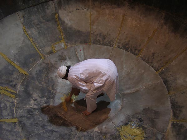 Świątynię otacza żmijowisko krętych, wąskich ulic, gdzie trwa wieczny odpust. Przylepieni do wysokich murów straganiarze frymarczą blaszaną biżuterią, cytatami z Koranu i ofiarnymi słodyczami. Niekończące się tłumy przestępują próg świątyni sprawnie zrzucając klapki i płynnym ruchem naciągając szale na głowę. Hindusi nie mają skrupułów, żeby żebrać pod muzułmańską bramą. Riksze manewrują między pielgrzymami, trąbiąc w niebogłosy. Czasem na środku drogi leży pies, jakby obojętne mu było, czy go rozjadą, czy nie. Szczurzy wyścig, rozpychanie się łokciami i znój. A za murem pluska fontanna i baldachimy oferują cień.