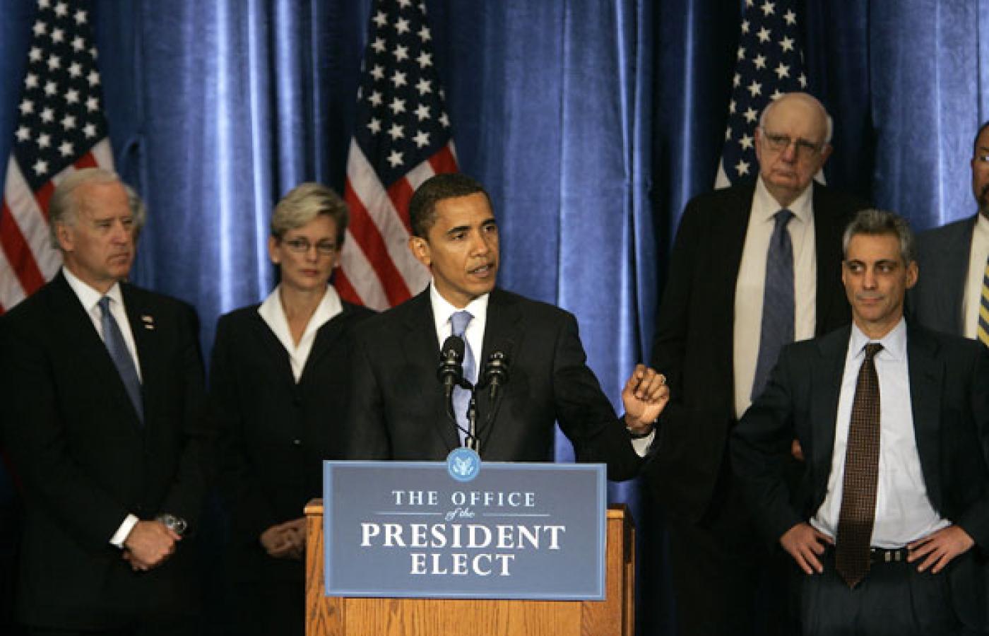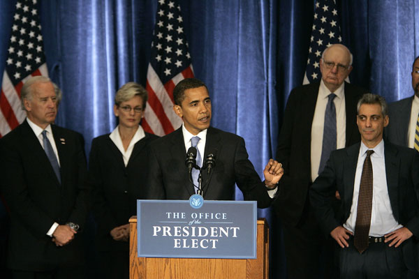 Obecnego prezydenta-elekta otaczają wybitni eksperci, absolwenci i profesorowie najbardziej prestiżowych amerykańskich uczelni z Ivy League, na ogół z lewego skrzydła Partii Demokratycznej. Jednak główne role w intelektualnym zapleczu Obamy wydają się odgrywać centryści. Dotyczy to zwłaszcza doradców ekonomicznych. Wśród najważniejszych dominują zwolennicy ograniczonej tylko interwencji państwa w rynek, wolnego handlu i niskich podatków. Jeden z najbliższych doradców Obamy to Paul Volcker, były prezes Rezerwy Federalnej (1979–1987), absolwent Uniwersytetu Harvarda i London School of Economics, wykładowca na Uniwersytecie Princeton. Jako szef Fed zapisał się w pamięci zwalczeniem dwucyfrowej inflacji przez podnoszenie stóp procentowych i obroną silnego dolara. Wymienia się go jako kandydata na ministra skarbu w przyszłym gabinecie Obamy, chociaż na przeszkodzie może stanąć podeszły wiek (81 lat).
