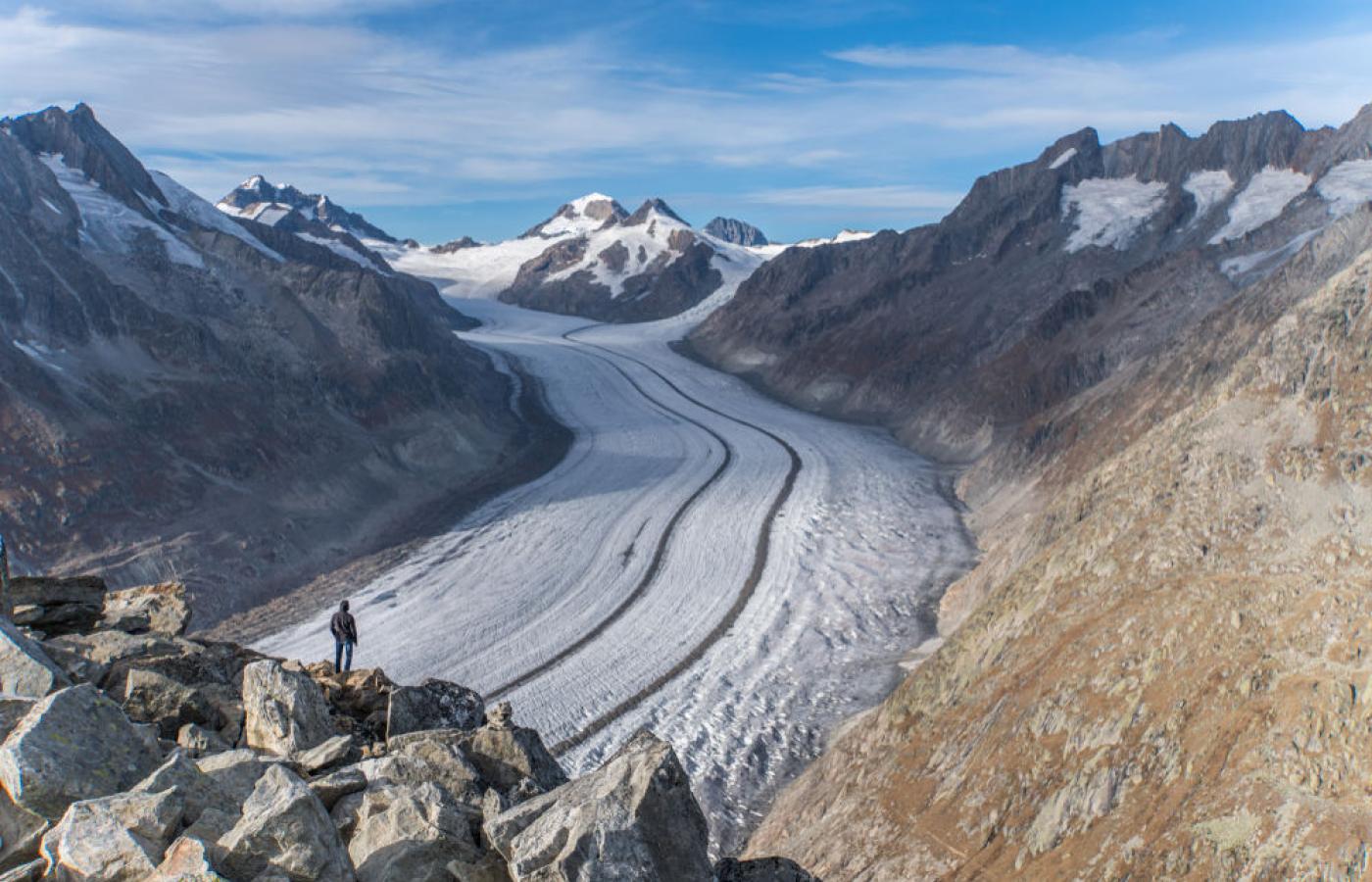 Oglądam więc Aletschgletscher na zdjęciu XIX-wiecznego francuskiego fotografika Adolphe’a Brauna. Monochromatyczna fotografia przedstawia szeroką panoramę drapieżnych gór z ogromnym, białym jęzorem lodu. To ikoniczny obraz, trwały element kolektywnej wyobraźni w tym zakątku świata nawet teraz, kiedy na skutek zmian klimatycznych największy alpejski lodowiec powoli odchodzi. Według obliczeń glacjologów, gdyby globalne temperatury jakimś cudem zatrzymały się na poziomie z ostatniej dekady, do końca XXI w. Aletsch zmalałby niemal o połowę. Przy ociepleniu do 2 stopni (jak zakładało porozumienie paryskie), zostanie z niego mniej niż połowa. Przy ociepleniu rzędu 4 stopni, a do tego w tej chwili zmierzamy, w 2100 r. pozostaną pojedyncze, rozproszone skrawki lodu. Jak to często bywa, obraz okazuje się trwalszy od przedstawianej rzeczywistości; patrzę na zdjęcie Brauna tak, jak ogląda się w antykwariacie stare fotografie nieznajomych, o których możemy się domyślać, że już poumierali.