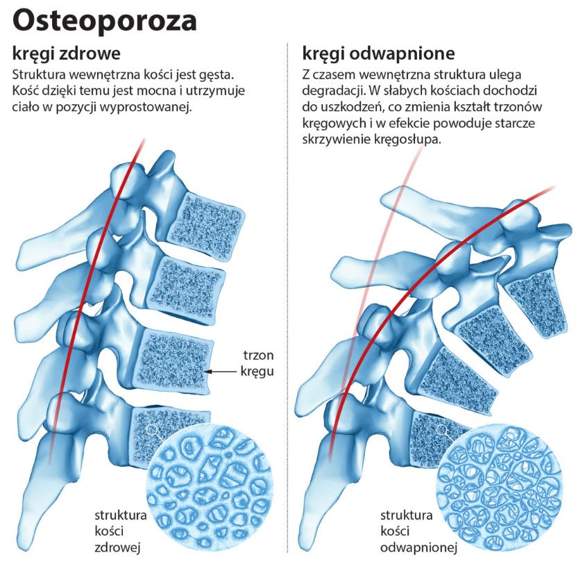 Od 30. roku życia, zarówno u kobiet, jak i mężczyzn, masa kostna – również kręgów – zmniejsza się o około 1 proc. rocznie, jednak po pięćdziesiątce proces ten mocno przyspiesza z powodu zaprzestania produkcji hormonów płciowych. Efektem jest zachwianie równowagi między odbudową kośćca a jego naturalnym zanikaniem, w wyniku czego w kościach zaczyna ubywać masy kostnej – stają się więc gąbczaste, słabsze, łamliwe. Trzony kręgów ulegają tym samym przemianom metabolicznym, a zatem pękają lub się kruszą. Milimetr po milimetrze zapadają się, powodując zmniejszenie wzrostu i pochylenie sylwetki.