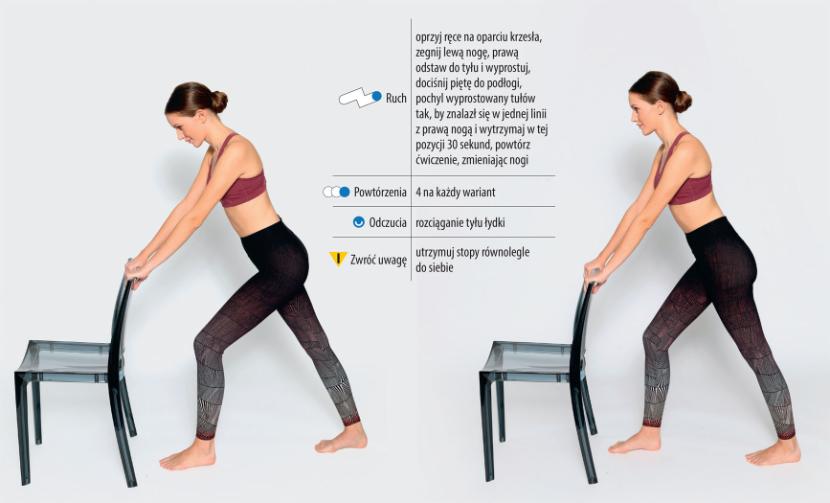 Ruch: oprzyj ręce na oparciu krzesła, zegnij lewą nogę, prawą odstaw do tyłu i wyprostuj, dociśnij piętę do podłogi, pochyl wyprostowany tułów tak, by znalazł się w jednej linii z prawą nogą i wytrzymaj w tej pozycji 30 sekund, powtórz ćwiczenie, zmieniając nogi