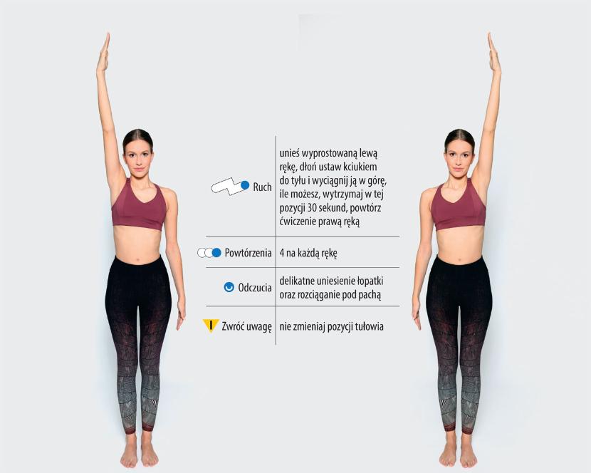 Ruch: unieś wyprostowaną lewą rękę, dłoń ustaw kciukiem do tyłu i wyciągnij ją w górę, ile możesz, wytrzymaj w tej pozycji 30 sekund, powtórz ćwiczenie prawą ręką
