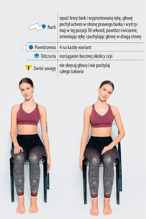 Ruch: opuść lewy bark i wyprostowaną rękę, głowę pochyl uchem w stronę prawego barku i wytrzymaj w tej pozycji 30 sekund, powtórz ćwiczenie, zmieniając rękę i pochylając głowę w drugą stronę