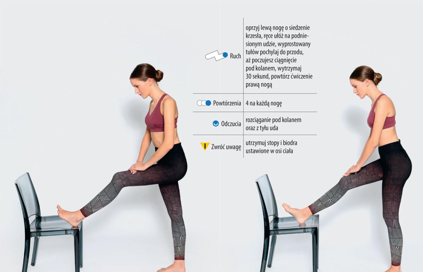 Ruch: oprzyj lewą nogę o siedzenie krzesła, ręce ułóż na podniesionym udzie, wyprostowany tułów pochylaj do przodu, aż poczujesz ciągnięcie pod kolanem, wytrzymaj 30 sekund, powtórz ćwiczenie prawą nogą
