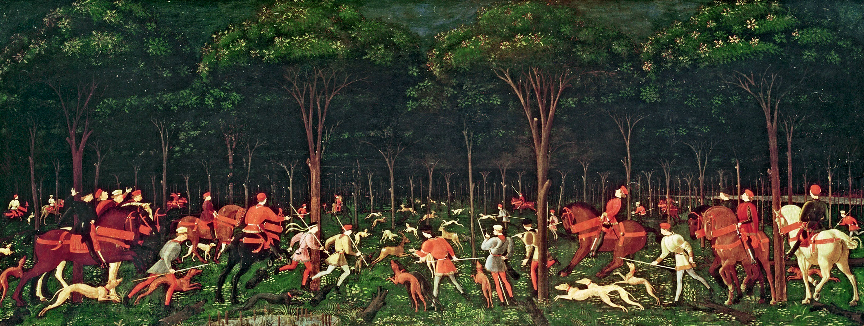 Obraz włoskiego mistrza renesansu przedstawia grupę myśliwych wyruszających na nocne polowanie w towarzystwie sfory psów, które rozbiegły się między drzewami. Obraz o tajemniczej historii (o jego istnieniu nie wiedziano do 1850 r., a autorstwo udało się ustalić po kolejnym półwieczu) i nastrojowej niezgłębionej aurze jest klasycznym przykładem przedstawienia w malarstwie psa jako druha myśliwych. Ów motyw pojawiał się w sztuce wielokrotnie, także na słynnych dziełach, takich jak „Łowcy w śniegu” Pietera Bruegla, „Wenus i Adonis” Tycjana czy obrazach myśliwskich Gustave’a Courbeta, nie mówiąc o płótnach naszych twórców – Maksymiliana Gierymskiego czy familii Kossaków.