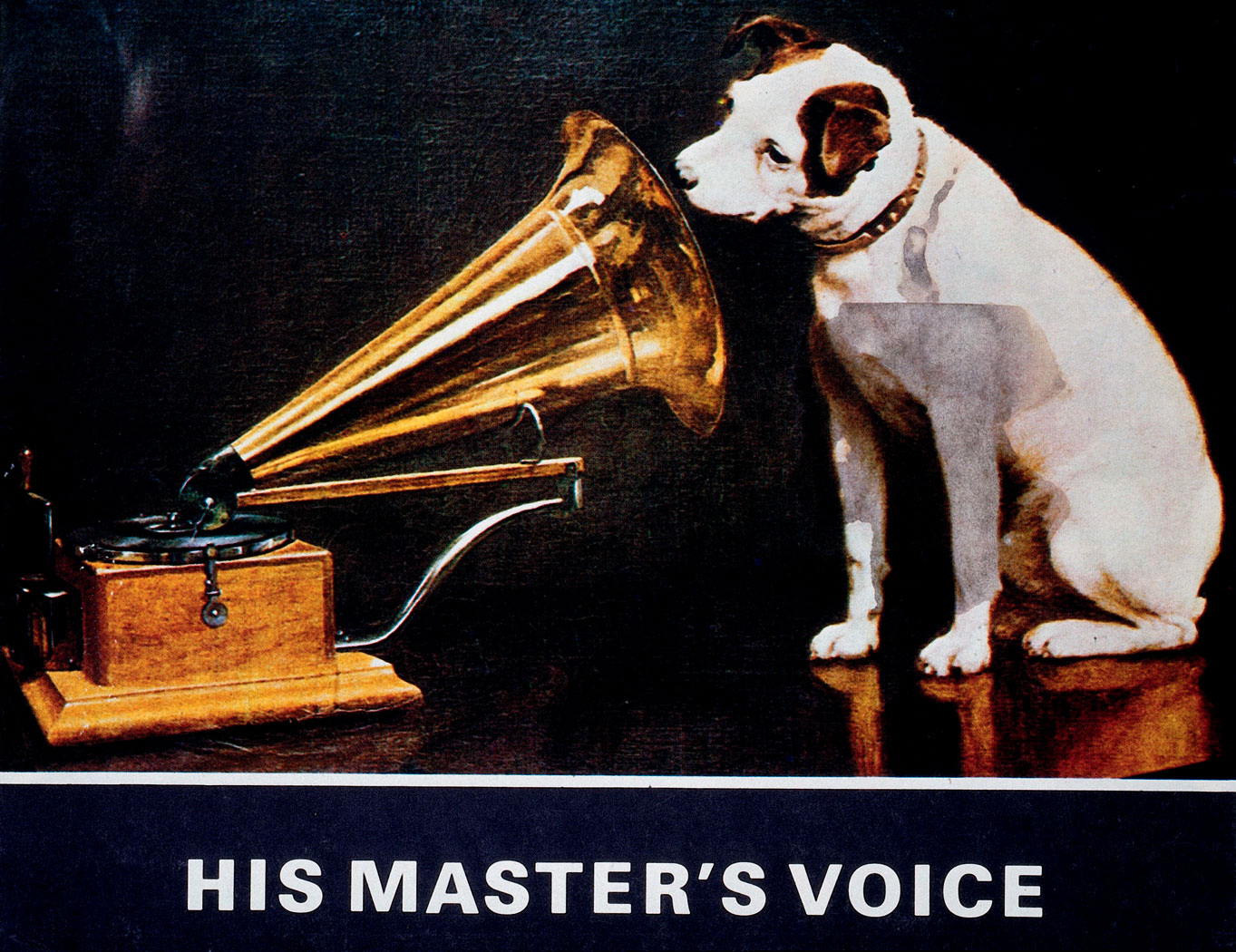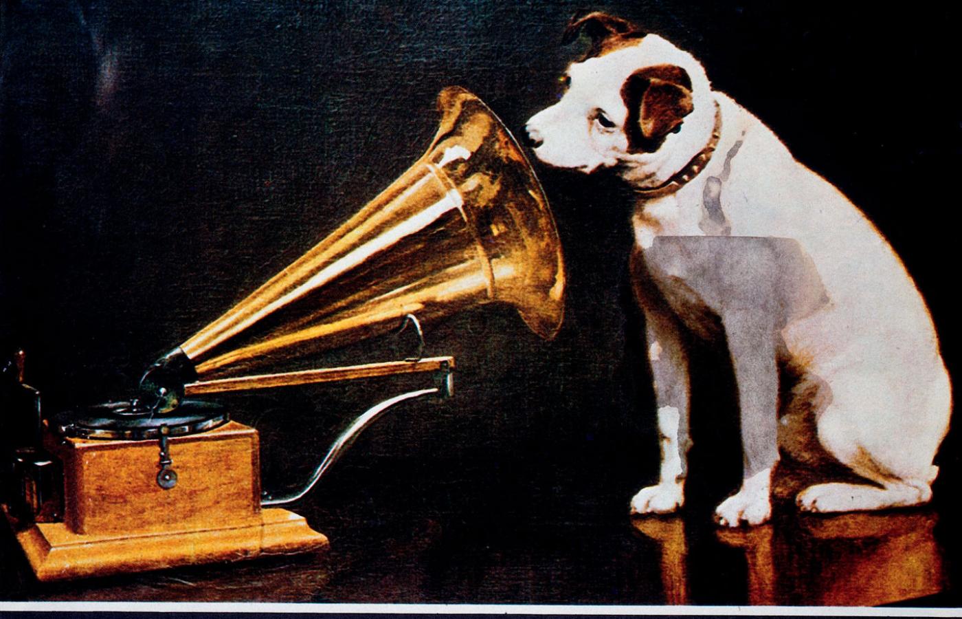 Na szczycie zwierzęcej piramidy przemysłu muzycznego siedzi dumnie pies Nipper. Siedzi i zagląda zaciekawiony do tuby starego fonografu, a towarzyszy mu slogan reklamowy „His Master’s Voice” (głos jego pana), sugerujący, że pionierska metoda zapisu dźwięku jest już tak doskonała, że wierny pies pomyliłby swojego pana z przodkiem gramofonu. Chociaż akurat ta aparatura do najwierniejszych nie należała. Urządzenia, w które spoglądał Nipper – prawdziwy pies namalowany pod koniec XIX w. przez Anglika Francisa Barrauda – zmieniały się zresztą wraz z rozwojem techniki, zmieniały się też nazwy firm, które przez dziesiątki lat reklamował (pierwszą była słynna wytwórnia Emila Berlinera, z której później powstała firma Deutsche Grammophon). Sympatyczny terier pozostał jednak symbolem nagrań dźwiękowych do dziś, od ponad 120 lat wypatrując pana, za którym oryginalnie naprawdę tęsknił. Bo Barraud opiekował się nim w zastępstwie swojego przedwcześnie zmarłego brata.
