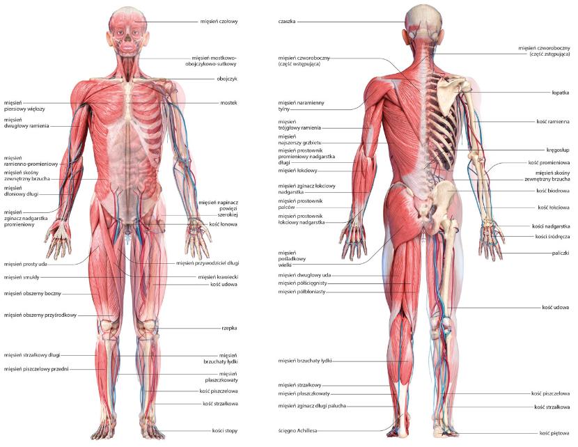 Mięśnie szkieletowe dają człowiekowi możliwość wykonywania ruchów. Jest ich w ciele 450–500 – to u mężczyzn 40 proc. masy ciała, u kobiet – 35 proc. Kości są rusztowaniem dla organizmu. Dorosły człowiek ma ich 206.