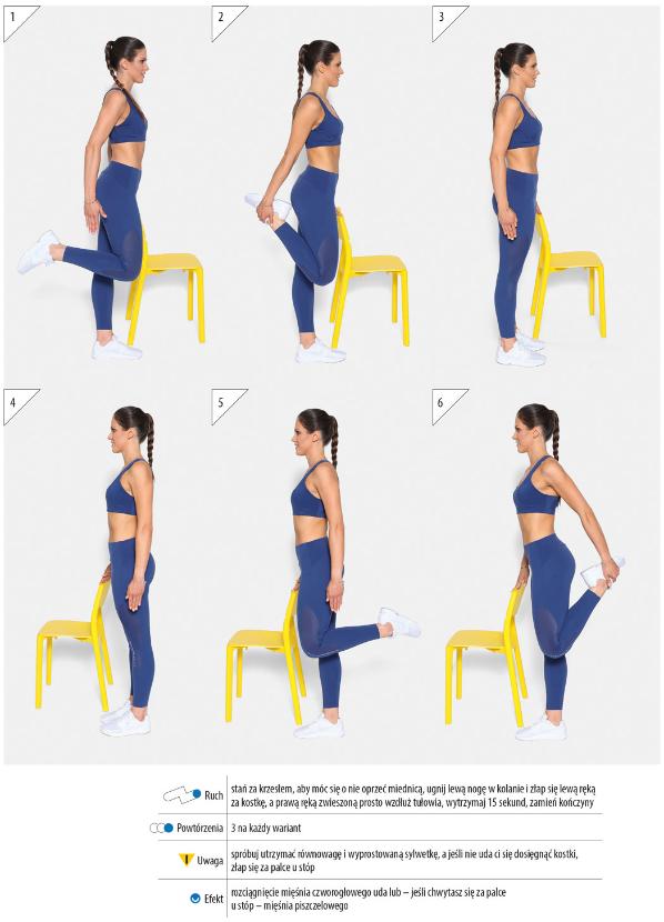 Ruch: stań za krzesłem, aby móc się o nie oprzeć miednicą, ugnij lewą nogę w kolanie i złap się lewą ręką za kostkę, a prawą ręką zwieszoną prosto wzdłuż tułowia, wytrzymaj 15 sekund, zamień kończyny